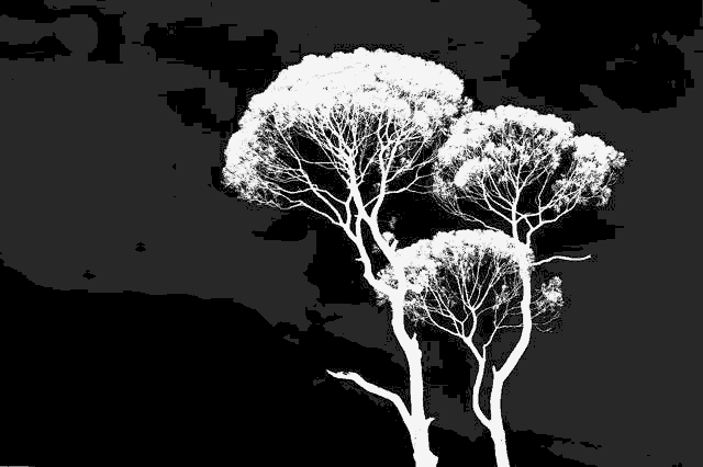In this example, we recolor a static black-and-white GIF of tree silhouettes by changing the balance of light and dark tones. We apply a limited palette of five grayscale colors, effectively flipping black areas to lighter tones and white areas to darker ones. This reduces the number of colors while creating a reversed white-and-black GIF. (Source: Pexels.)