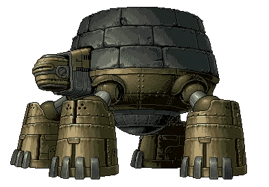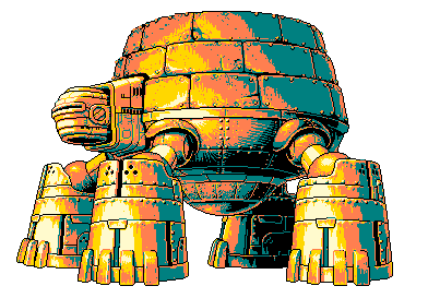 In this example, we load an animated sprite of the Stone Turtle, a boss from Metal Slug 5, and repaint it using a custom color palette. The original animation uses muted gray and olive tones, so we replace them with brighter colors such as teal, coral, gold, and black. (Source: SNK.)