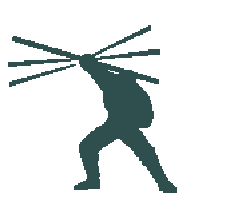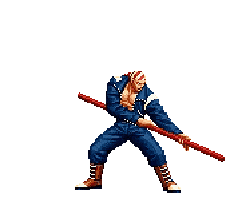 In this example, we extract a single frame to create a static silhouette. We load an animated sprite GIF of the character Billy Kane (from the Fatal Fury / King of Fighters series). We stop the silhouette animation and set the frame number to 47 to capture a specific pose. We apply a darkSlateGray fill color and keep the background transparent, reducing the detailed character to a clean silhouette suitable for a guess-the-character game. (Source: SNK.)