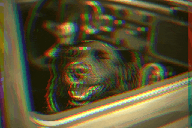 In this example, we create a nostalgic retro look from a static GIF of a dog enjoying a car ride. We apply slight pixelation at 2 and chromatic aberration at 12 to introduce subtle distortion, then shift red and green channels to warm up the tones. We enable the vignette effect to darken the edges and turn on the vintage filter to give the GIF a soft sepia-style appearance. (Source: Pexels.)