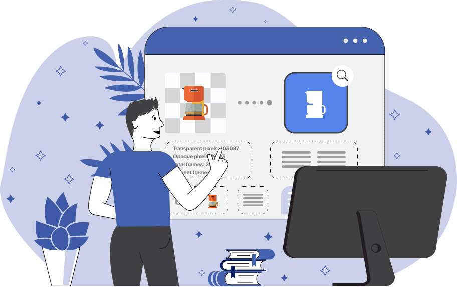 In this example, we search for transparent pixels in an animated GIF to check whether transparency appears in places where it is not expected. When viewing the animation on a white background, white opaque pixels can look almost identical to transparent pixels. To clearly distinguish between them, we convert opaque pixels to black and mark transparent pixels in red. We also slow down the GIF playback slightly (to 250 ms per frame, equal to 4fps) so the entire animation can be viewed from start to finish, giving enough time to carefully examine each frame. (Source: Pexels.)