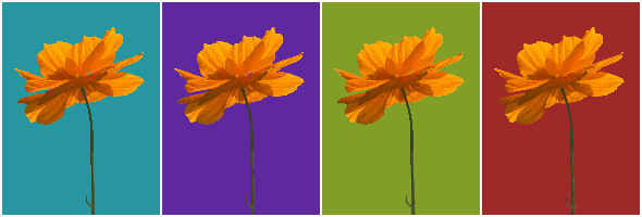 In this example, we load a static flower GIF and compare how it looks on four custom background colors defined using RGB values. We arrange the previews side by side, scale the GIF down to 30%, and add small gaps with a white canvas background. By viewing all variations together, we easily decide which background color best complements the flower before using it in a greeting card or visual design. (Source: Pexels.)